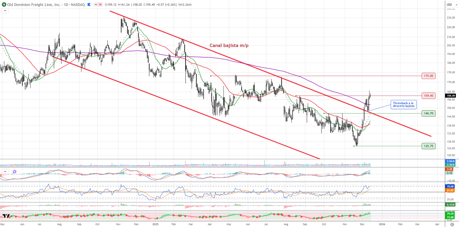 Old Dominion Freight Line es un claro ejemplo de fortaleza relativa. El valor ha perforado su directriz bajista interanual, ha realizado un throwback muy ordenado y posteriormente ha retomado las subidas.