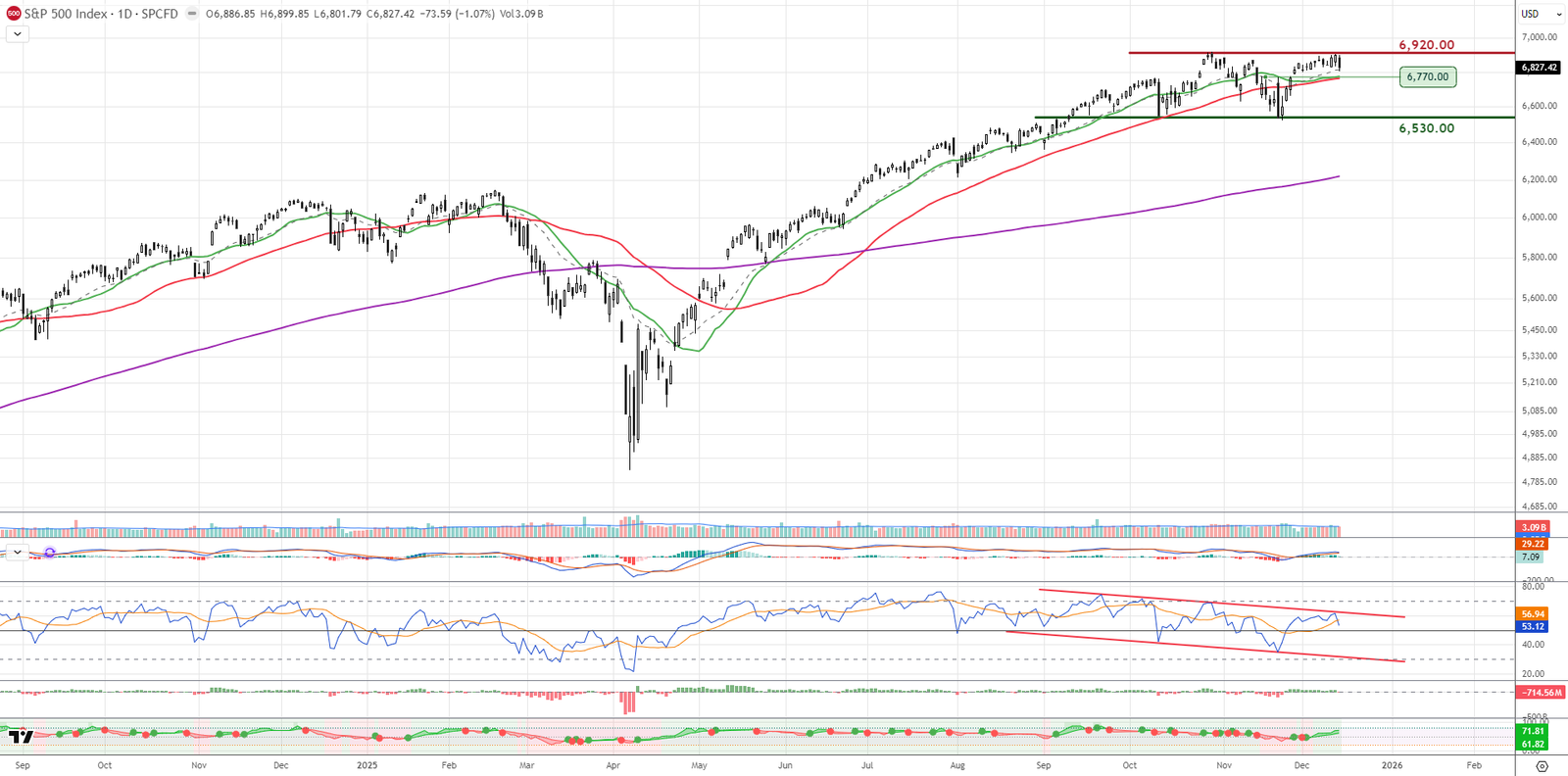 Desde un punto de vista técnico, el S&P500 continúa moviéndose dentro de un rango lateral bien definido, con una resistencia muy clara en la zona de los 6.920 puntos que sigue frenando cualquier intento de avance. Los rechazos recientes en este nivel refuerzan la idea de agotamiento comprador.
