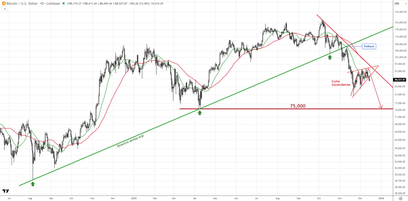 Bitcoin ha confirmado una ruptura a la baja de una cuña ascendente, figura de implicaciones bajistas, tras perder previamente su directriz alcista de medio plazo. El pullback posterior ha sido muy limpio y ha dado paso a un nuevo tramo de debilidad.