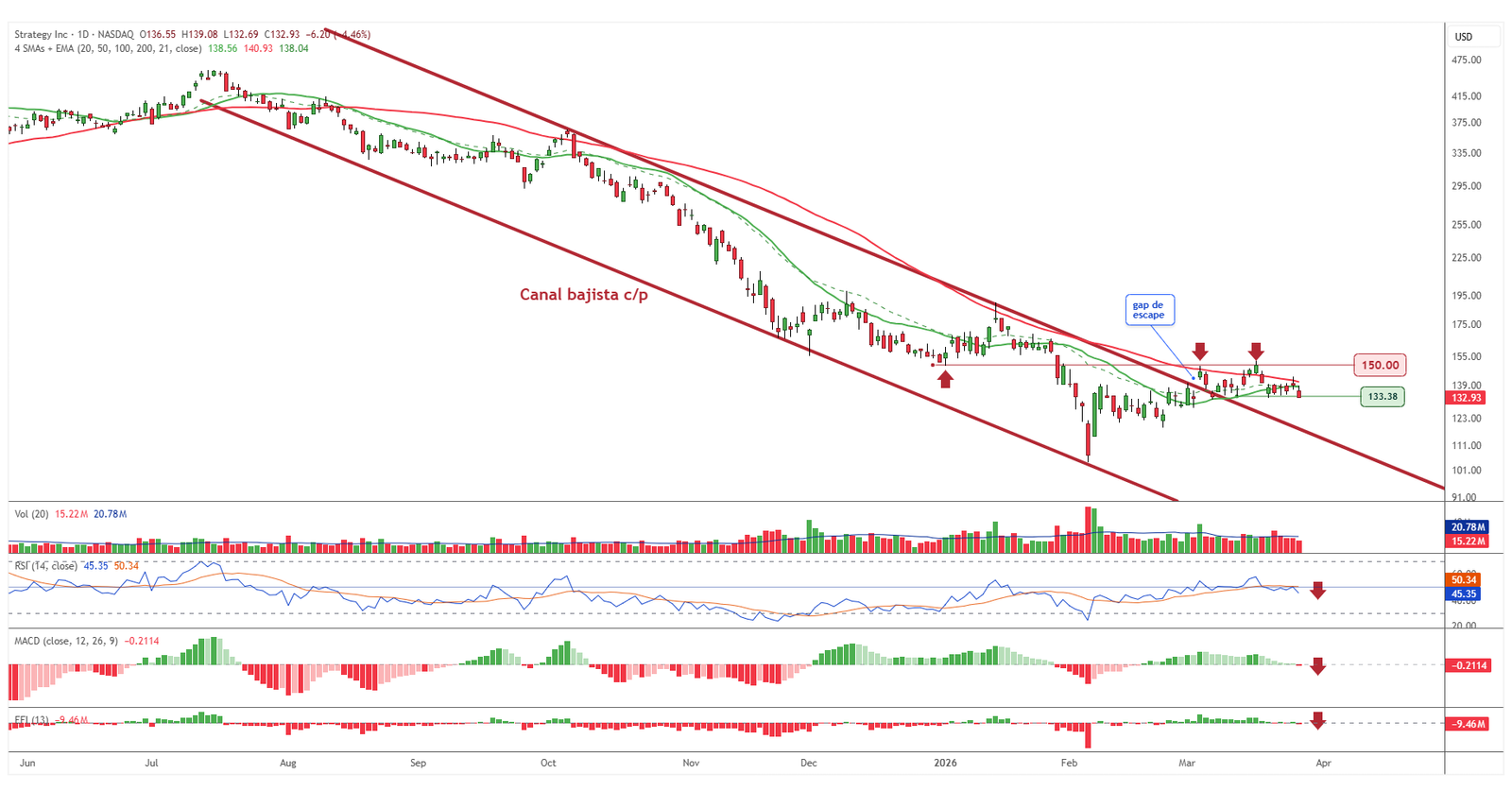 La caída de la sesión ha llevado al precio a perforar el soporte de los 133,38 dólares, un nivel que había actuado como referencia en las últimas jornadas. A esto se suma un deterioro de los indicadores, con el RSI por debajo de 50, un MACD en negativo y el precio cotizando por debajo de sus medias móviles relevantes. El escenario obliga a replantear la gestión de la posición, con un posible ajuste del stop si la debilidad persiste en próximas sesiones.