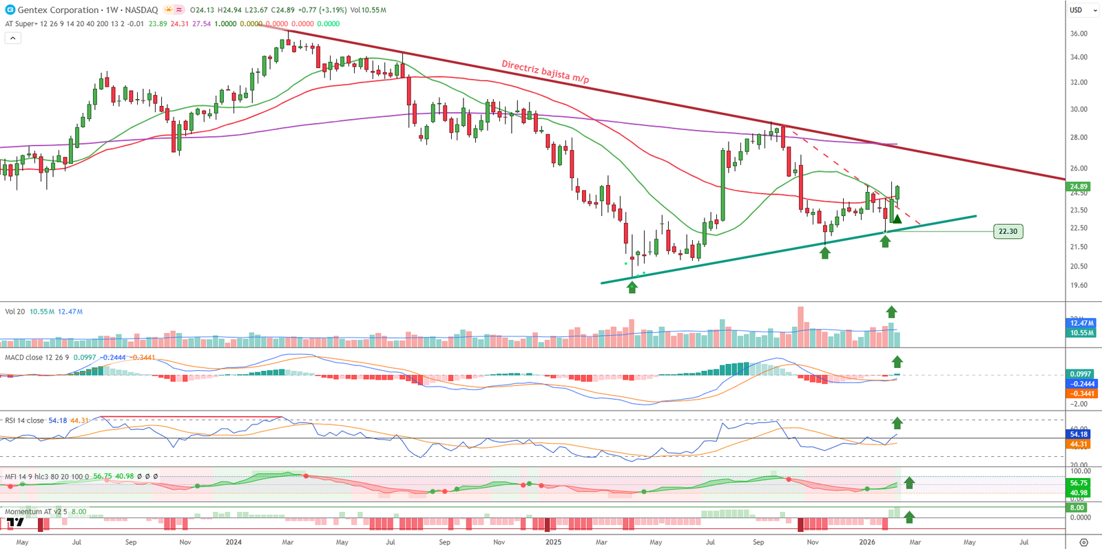 El escenario técnico se ve respaldado por unos indicadores claramente constructivos. El MACD recupera terreno y cierra en positivo, el RSI cruza su media de 14 periodos y supera el nivel de 50 puntos, mientras que el flujo monetario se inclina hacia el lado comprador.